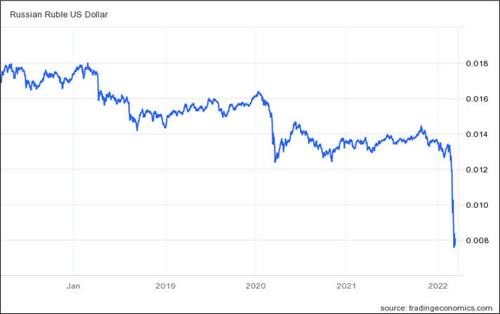 On 9 Mar 2022, the Fitch Ratings followed S&P Global and Moody’s to downgrade Russian government bonds to junk status and warned of an imminent Russian “sovereign default”. Estimates suggest Russia owes roughly USD 40 billion worth of euro- and dollar-denominated sovereign debt, of which USD 20 billion is held by foreigners.