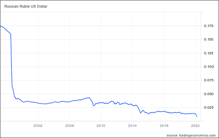 For instance, in the chart below, the Ruble’s fall off the cliff in the first week of March 2022 seems like it did not happen when you look at the same USD vs Ruble chart – but this time – over a longer period of 25 years!