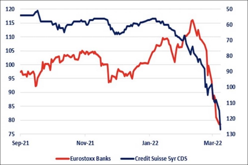 The Credit Suisse CDS have fallen sharply indicating the market’s anticipation of distress for the bank. European bank stock prices have been hammered indicating worries over the loan exposure to Russia.