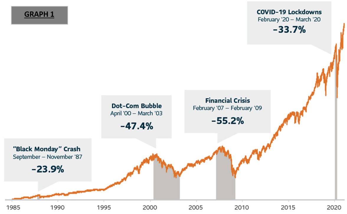 Fact 1: It’s not about “Timing the Markets”, but about “Time IN the Markets”. Time smooths out corrections and market crashes as evidenced in GRAPH 1.